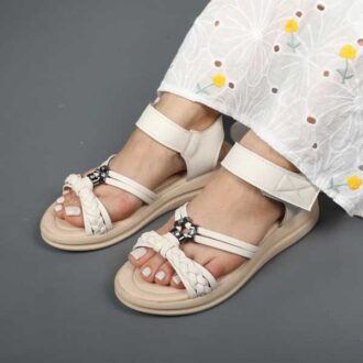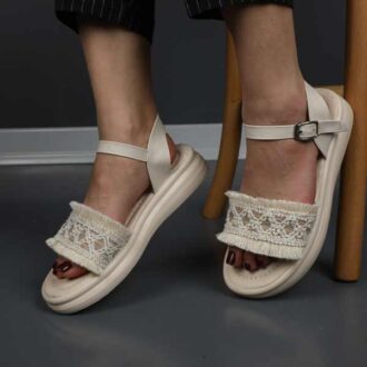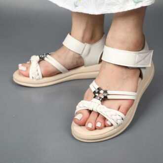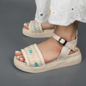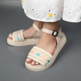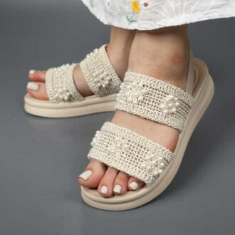صندل زنانه بافتی مدل حصیری نگینی کرم نسکافه ای