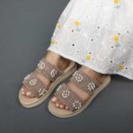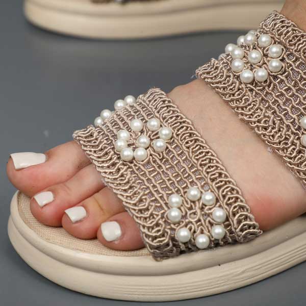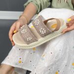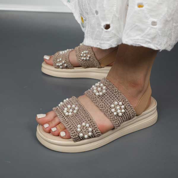 صندل زنانه بافتی مدل حصیری نگینی کرم نسکافه ای